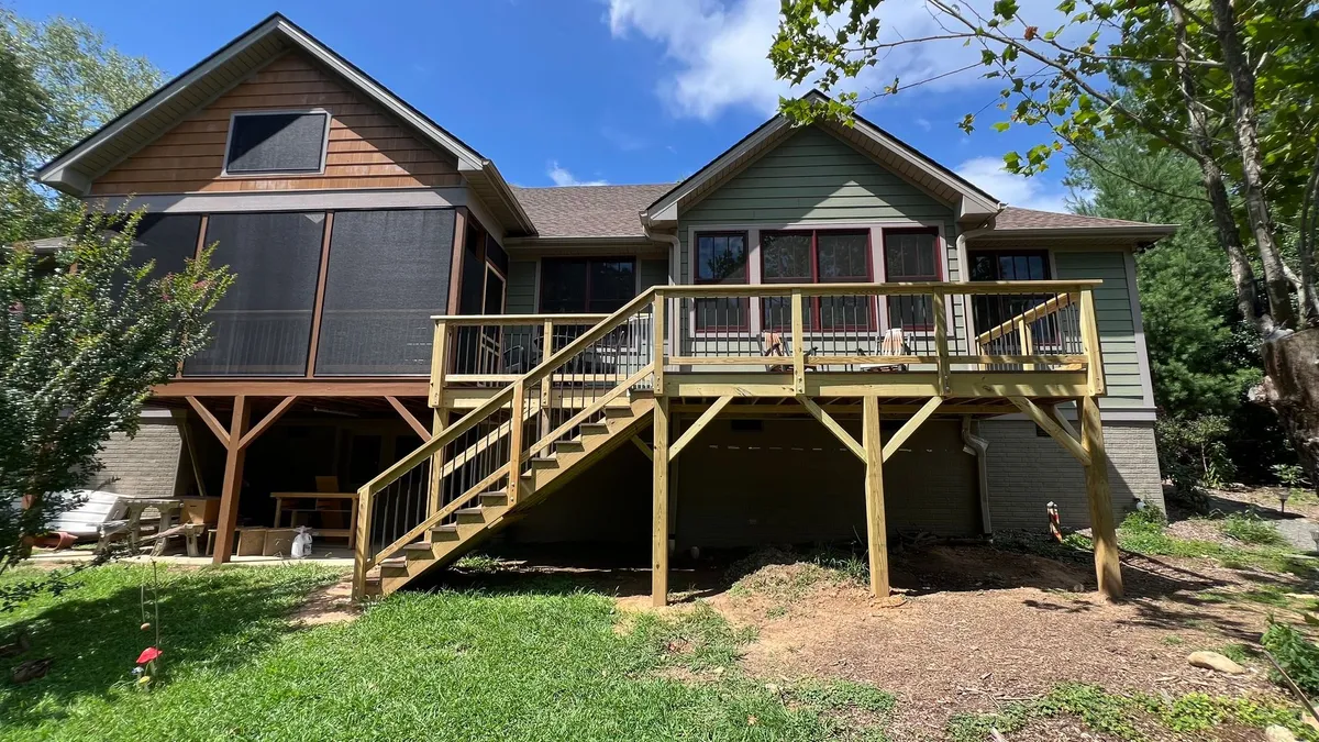 Premium materials like Trex composite and hardwood. Designed for mountain living in Asheville.